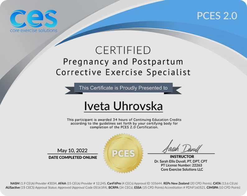 I am a certified Pregnancy and Postpartum Corrective Exercise Specialist, certified Personal Trainer (ISSA and NCSF), certified Yoga Teacher.